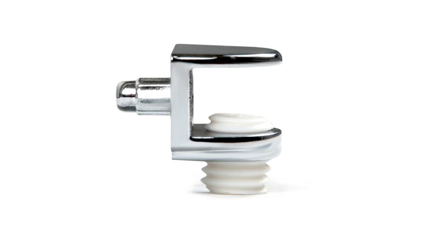 Металлический полкодержатель для стеклянных или тонких фанерных полок  с опорой полочкой и регулируемым фиксатором теперь обладает модернизированной формой опорного штифта для большей функциональности и удобства