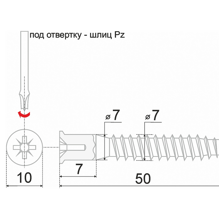 ST08/05 — винт-стяжка (конфирмат) 7*50 с универсальным отверстием для короткой и длинной заглушки, с резьбой под отвертку – шлиц Pz. Используется для сборки корпусной мебели из ДСП, ЛДСП, дерева и конструкций из многослойной фанеры.