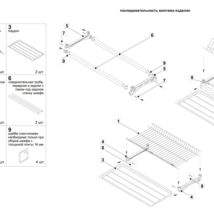Размер пластиковых поддонов рассчитан под мебельные модули, которые предполагают использование плиты 16 мм. Для адаптации поддонов сушки к проему, полученному при использовании плитных материалов толщиной 18 мм, необходи