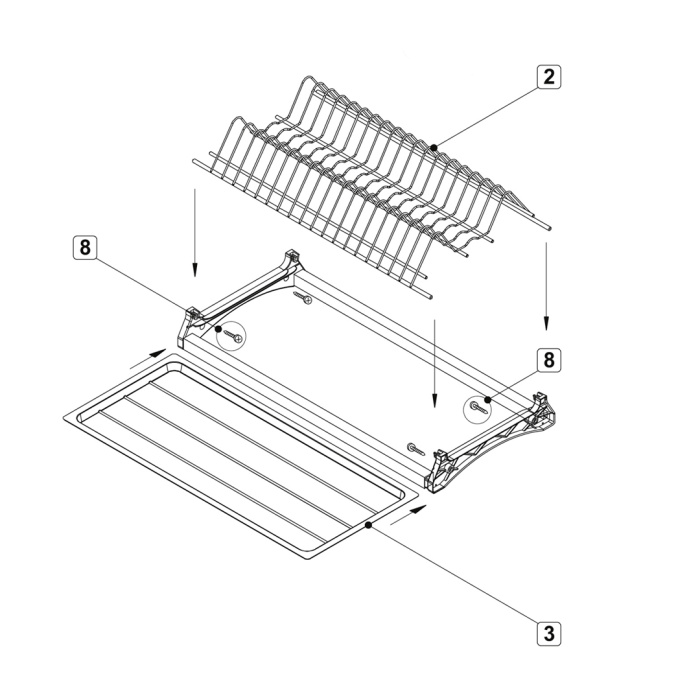 Комплект сушки включает 2 яруса для хранения посуды с надёжным гальваническим покрытием с эффектом хромирования, 2 съёмных поддона из качественного бесцветного пластика, 4 пластиковых серых держателя нижнего и верхнего уровней, переднюю и заднюю алюминиевые трубки, саморезы для монтажа сушки и крепления трубки.
