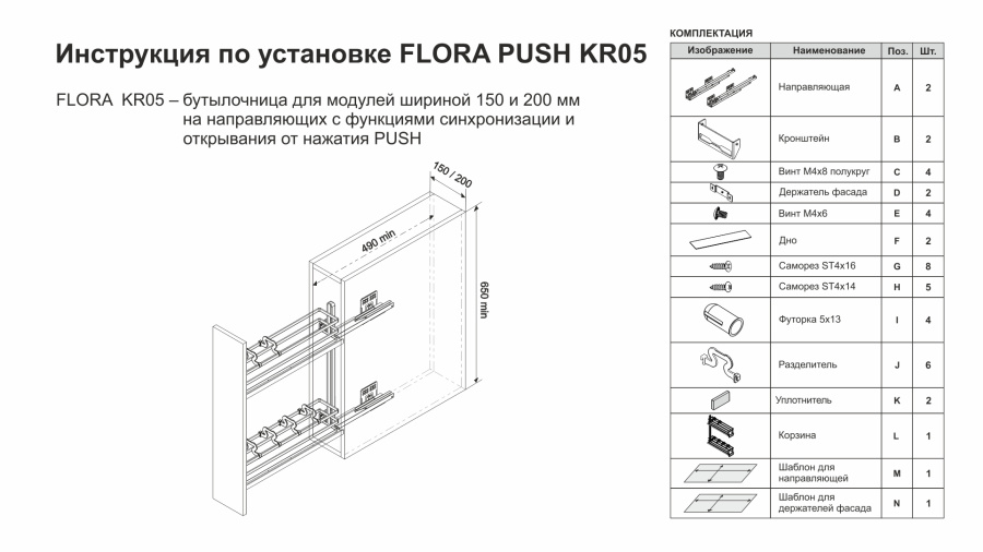 FLORA PUSH — это современная комфортная бутылочница с механизмом открывания от нажатия, предназначена для удобного хранения ёмкостей различной высоты в модулях шириной 150 или 200 мм.