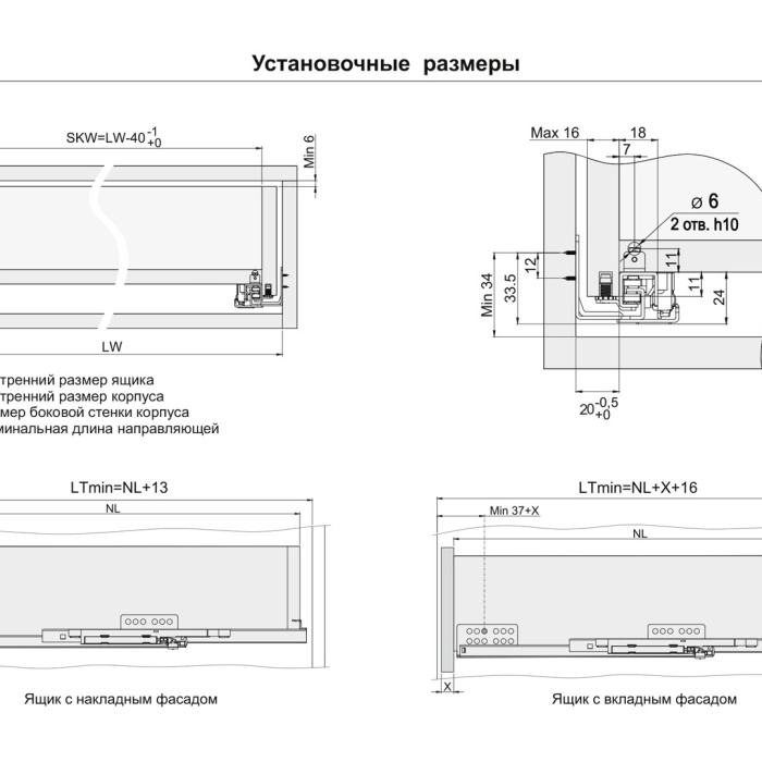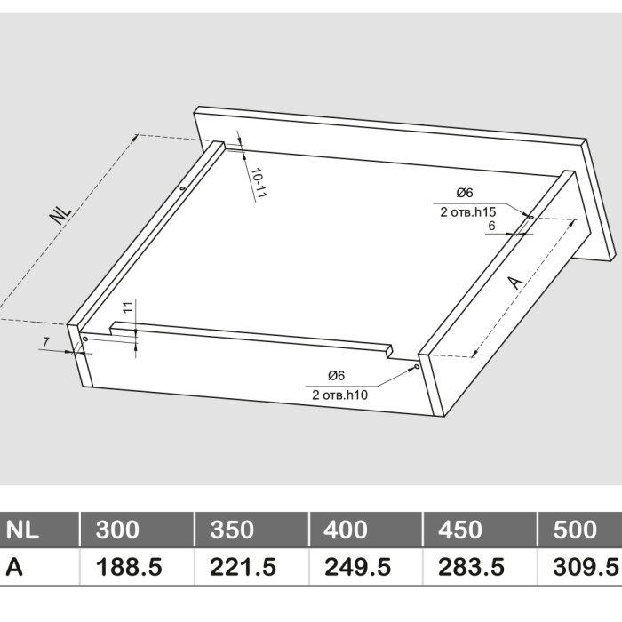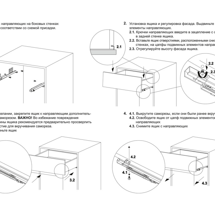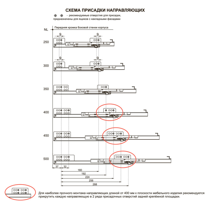 Для наиболее прочного монтажа направляющих длиной от 400 мм к плоскости мебельного изделия рекомендуется прикрутить каждую направляющую в 2 ряда присадочных отверстий задней крепёжной площадки.