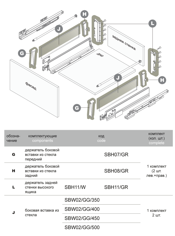 Боковая матовая вставка из стекла – это декоративная вставка по всей длине боковин выдвижного ящика, которая обеспечивает мебели роскошный и элегантный вид, а также гарантирует боковую фиксацию содержимого ящика. Боковая вставка из стекла применяется преимущественно в высоких ящиках. Для удобства производителя мебели в ассортименте BOYARD есть стеклянные вставки самых популярных длин – от 350 до 500 мм.