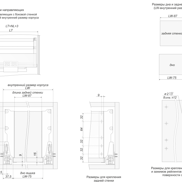 Прямоугольные рейлинги представлены в двух популярных цветовых решениях: белом и сером. Цветовой ассортимент позволяет подобрать рейлинг, идеально совместимый по стилю с боковинами и с внутренней отделкой ящика. Рейлинги прямоугольной формы отлично по