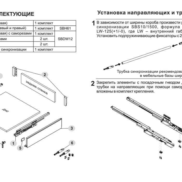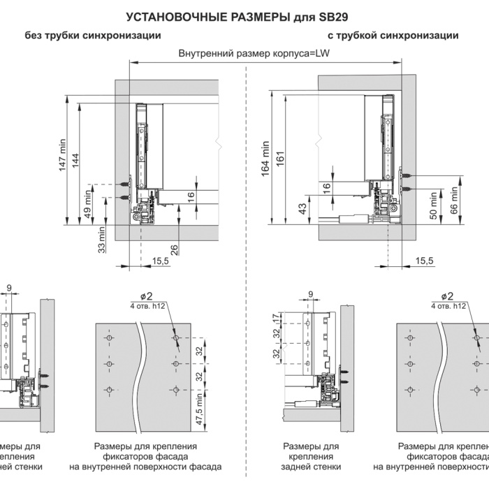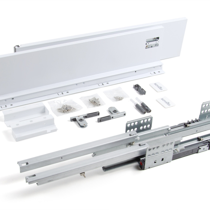 СТАРТ PUSH SB29 — комплект систем выдвижения для сборки выдвижного мебельного ящика с прямыми боковинами средней высоты с открытием от нажатия для мебели без ручек.