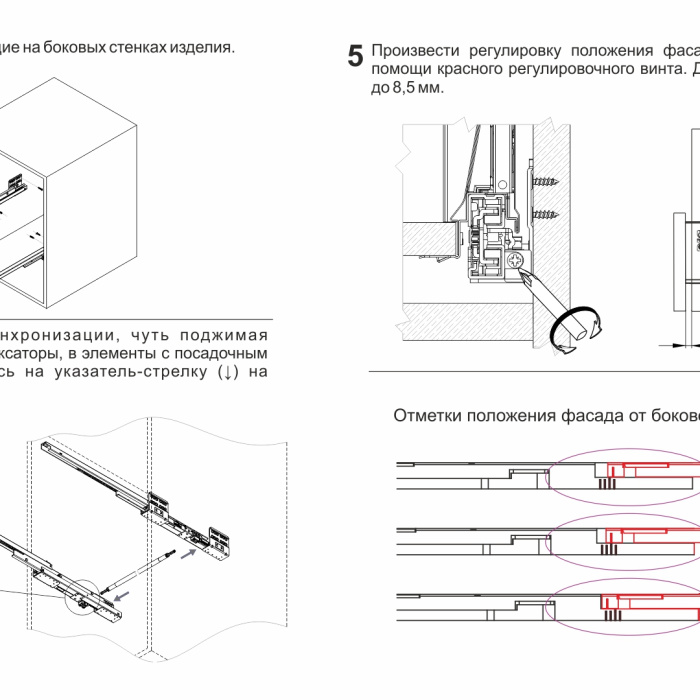 Конструкция СТАРТ PUSH SB29 имеет регулировочный красный винт — он позволяет выровнять фасады по глубине и компенсировать погрешности производства и монтажа. Специальные риски на направляющей помогут выставить одинаковое положение регулировки на обеих направляющих (левой и правой).