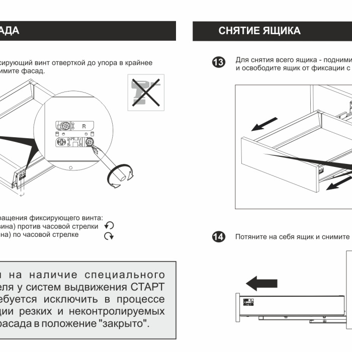 Система СТАРТ PUSH обеспечивает полное выдвижение после нажатия на фасад. Направляющие системы оснащены зубчато-реечным механизмом синхронизации, обеспечивающим равномерный ход и исключающим перекосы при движении.
